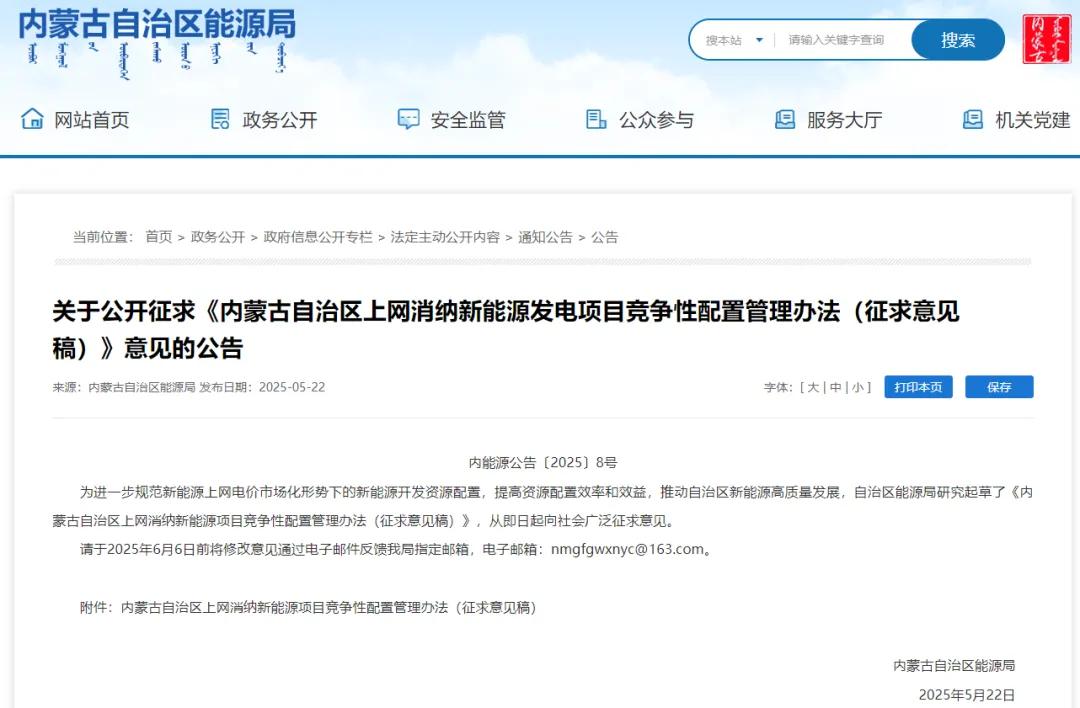 储能中国网获悉,5月22日,内蒙古自治区能源局发布关于公开征求《内蒙古自治区上网消纳新能源发电项目最大配资官网竞争性配置管理办法(征求意见稿)》意见的公告。